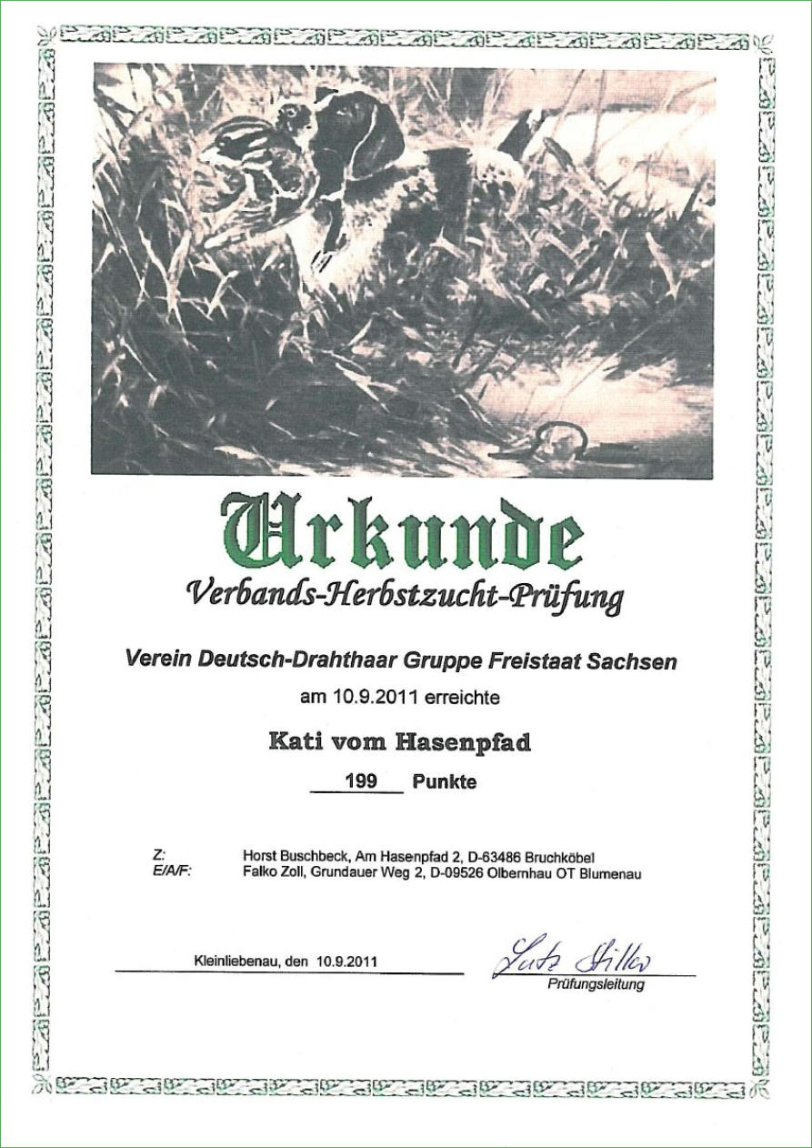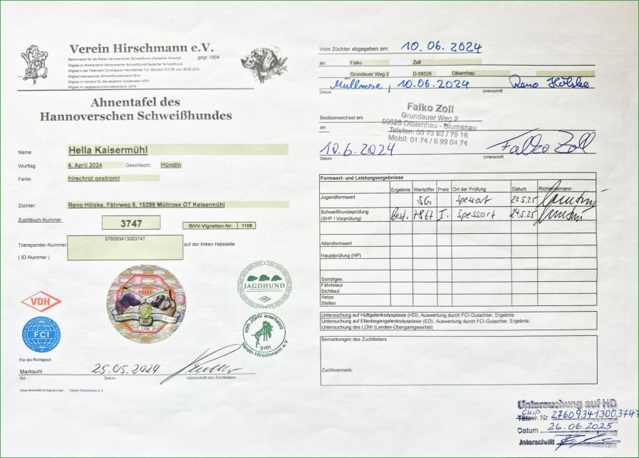 Schweißhündin „Hella Kaisermühl“Seit Juni´2024 bin ich im Besitz der Hannoverschen Schweißhündin „Hella Kaisermühl“, die am 24. Mai´2025 im Spessart ihre Schweißhundeprüfung VP erfolgreich abgeschlossen hat. Hella steht ab sofort für anfallende Nachsuchen zur Verfügung. Um die Nachsuchen gut zu planen, gebe ich folgende Tipps an Jäger: -Anschuss verbrechen (nicht nachgehen)-Anruf 037363/7816 oder 0174/6990474-Treffpunkt vereinbaren-Absprache NachsucheDer Erfolg einer Nachsuche hängt vom richtigen Verhalten nach dem Schuss oder nach einem Verkehrsunfall ab. Ich wünsche eine gute Zusammenarbeit und Waidmanns heil.Falko Zoll Schweißarbeit ist aktiver Tierschutz!