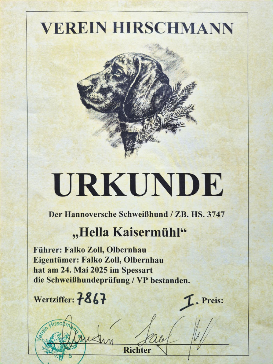 Schweißhündin „Hella Kaisermühl“Seit Juni´2024 bin ich im Besitz der Hannoverschen Schweißhündin „Hella Kaisermühl“, die am 24. Mai´2025 im Spessart ihre Schweißhundeprüfung VP erfolgreich abgeschlossen hat. Hella steht ab sofort für anfallende Nachsuchen zur Verfügung. Um die Nachsuchen gut zu planen, gebe ich folgende Tipps an Jäger: -Anschuss verbrechen (nicht nachgehen)-Anruf 037363/7816 oder 0174/6990474-Treffpunkt vereinbaren-Absprache NachsucheDer Erfolg einer Nachsuche hängt vom richtigen Verhalten nach dem Schuss oder nach einem Verkehrsunfall ab. Ich wünsche eine gute Zusammenarbeit und Waidmanns heil.Falko Zoll Schweißarbeit ist aktiver Tierschutz!