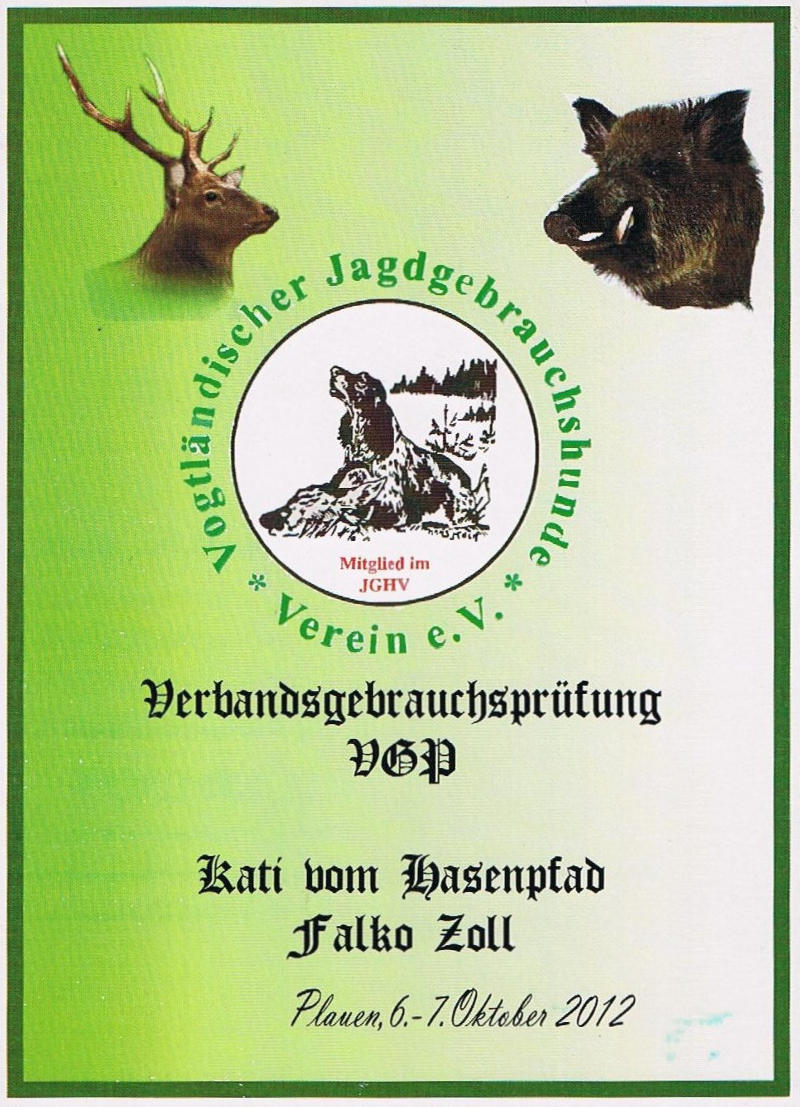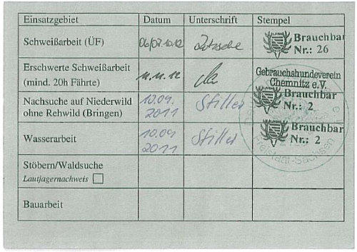 Als Höhepunkt konnte "Kati vom Hasenpfad" am 11.11.2012 die erschwerte Schweißprüfung (20 h) mit Erfolg absolvieren und steht seit dieser Zeit in ständigem Einsatz bei Nachsuchen auf Schalenwild.